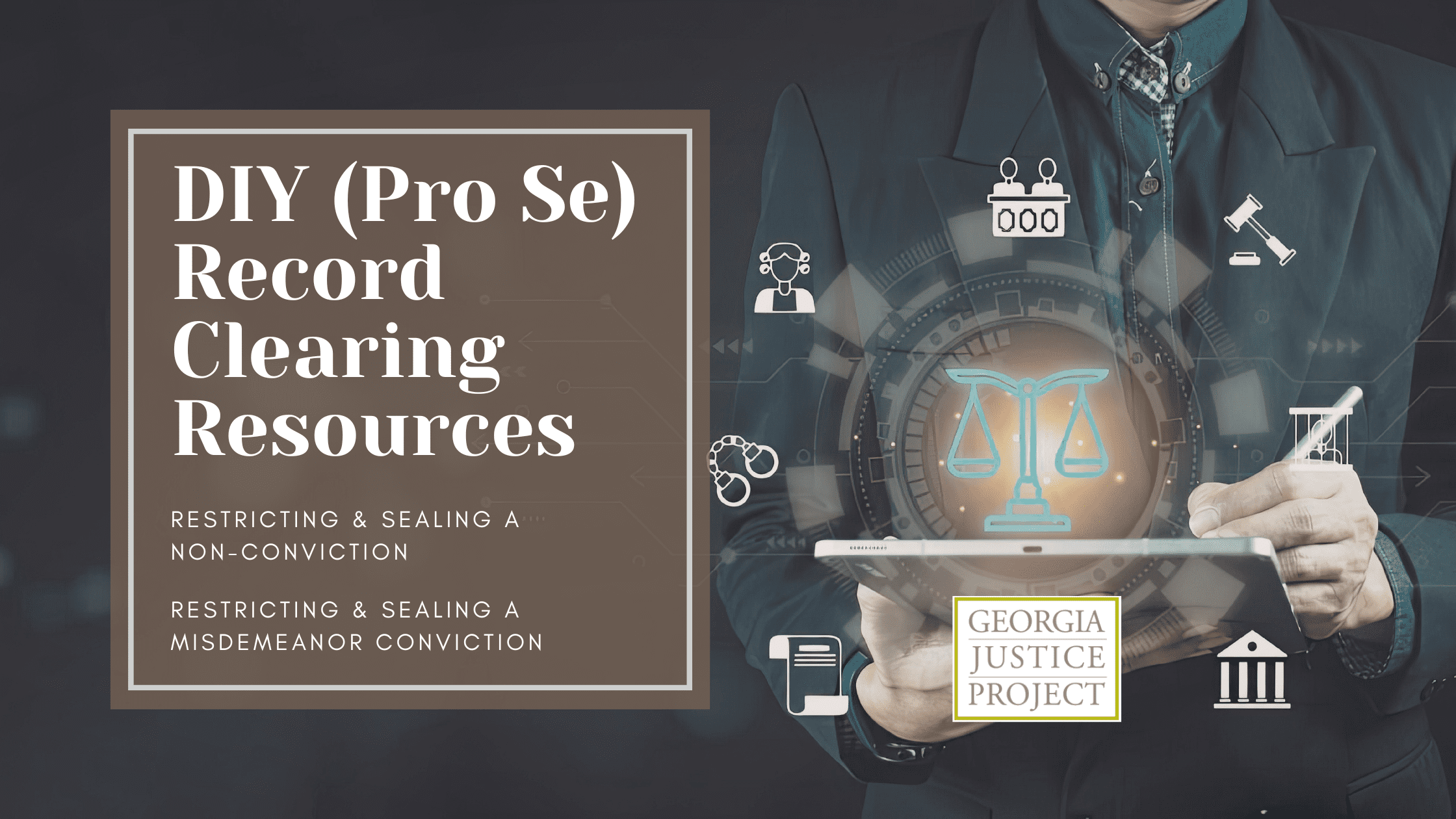 Georgia Justice Project (GJP) has created these resources to help individuals restrict and seal cases on their record on their own. You will find a video and template motion walking through the process for non-convictions and misdemeanor convictions. Disclaimer: Videos and template motions are provided for reference purposes only and do not create an attorney-client relationship with GJP. RESTRICTING AND SEALING A NON-CONVICTION Click below if you have a case that did not end in a conviction. This is for … read more GJP’s Do It Yourself (Pro Se) Record Clearing Resources