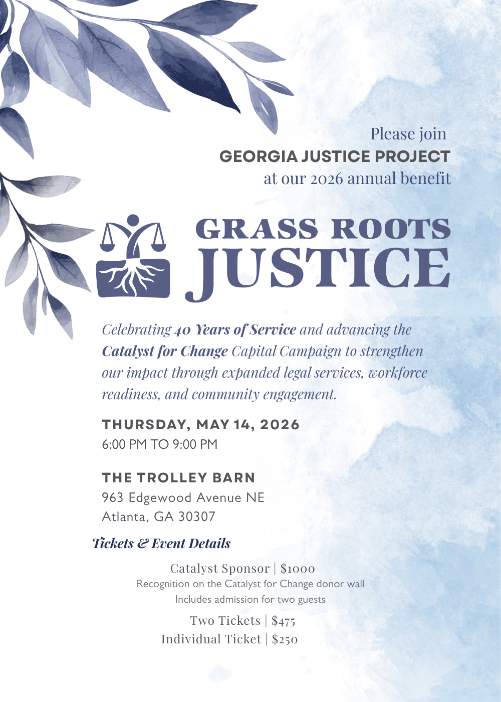🔊 Listen to Post Join us for the 2026 Grass Roots Justice Awards as we celebrate 40 years of impact and look ahead to the future of our work. This milestone evening will honor our Sheandra Clark Volunteer of the Year Award recipients – Tomikca Jackson, Christopher J. Fickes, and Valeria Cometto of Delta Air Lines, and recognize the community partners who help make our work possible. The program will feature powerful client stories and an update on our Catalyst … read more Grass Roots Justice Awards 2026